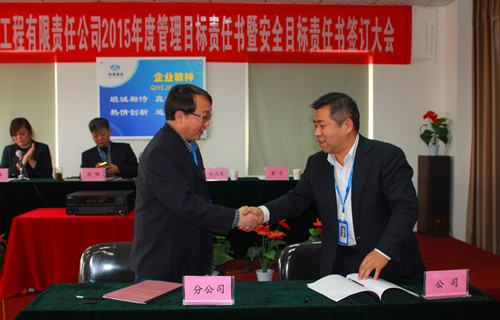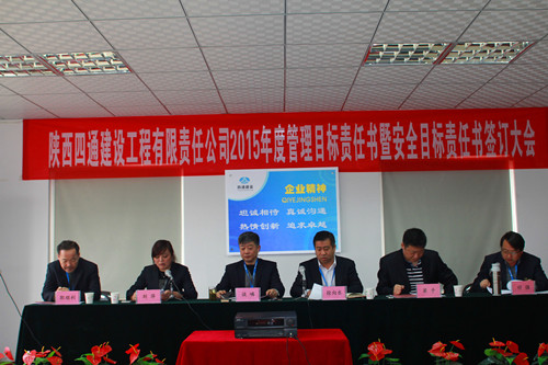 为明确经营目标,落实管理责任,为促进2015年度公司经营目标及工作计划的实施,经公司总经办认真审核研究,制定出陕西四通建设工程有限责任公司各部门、各子、分公司2015年工作目标责任书。2015年3月27日下午两点,公司在机械化分公司三楼会议室举行2015年度公司目标责任书签订仪式。会议由总经办组织,公司总经理徐总等公司领导,公司机关各部门、各子、分公司主要负责人出席了会议,行政总监刘总主持会议。